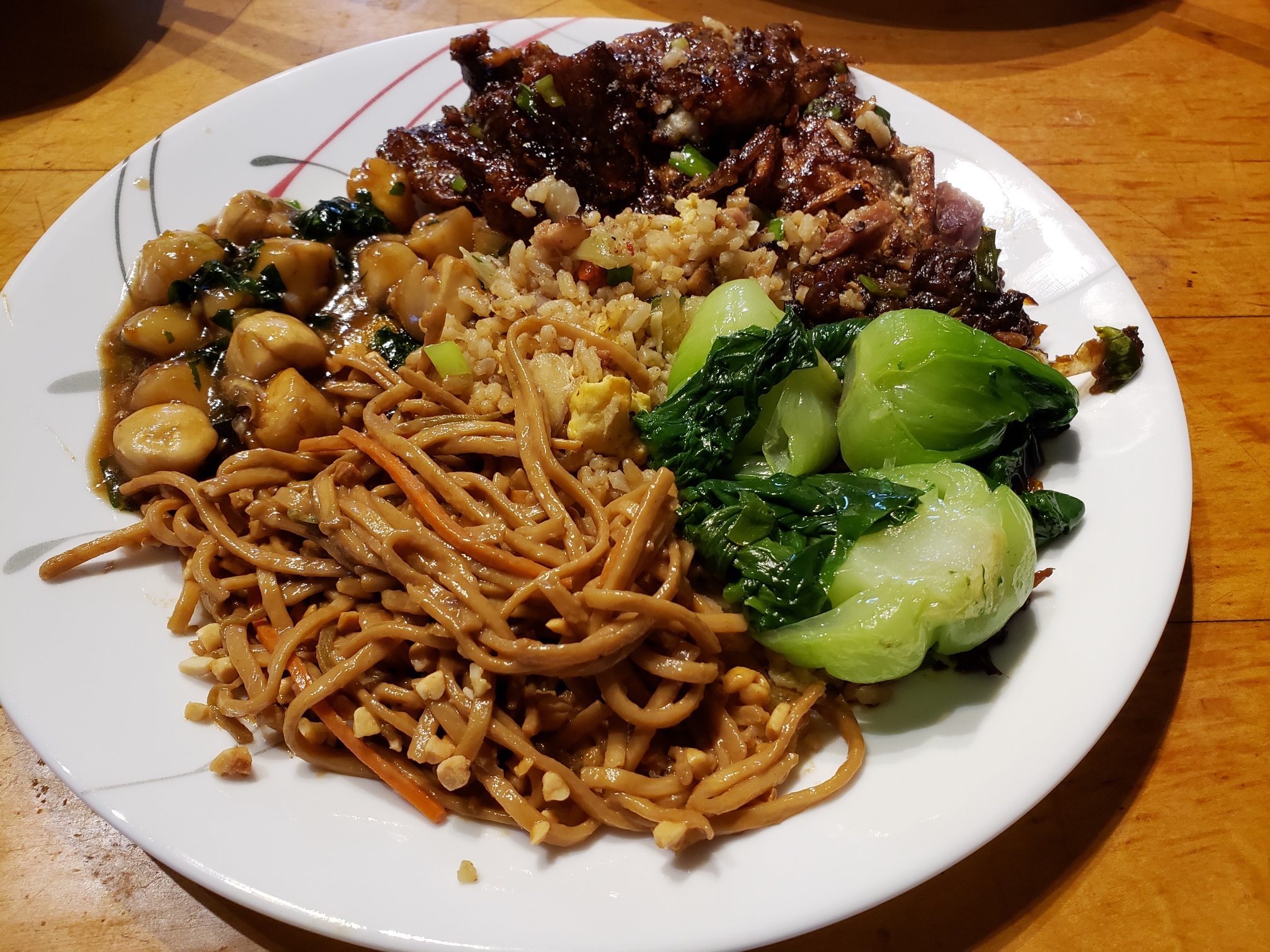 To make those dishes, I still needed to go to grocery store to pick up spinach and fresh water chestnuts (to go with the scallops). I figured I could also make a couple easy vegetable sides: stir-fried baby bok-choy, and dry-fried eggplant nuggets. One thing I love about the Kuo cookbook is that it has a lot of simple vegetable side dishes, running counter to the tendency to throw everything into one big stir-fry. I figured I should also make a little curried fried rice (not a proper recipe, but the link will give you a sense of what I improvised). Finally, I wanted to make some kind of dessert. As I didn't have anything authentically Chinese in mind, I turned to the China Moon Cookbook for something merely compatible. I decided to try the walnut chocolate tart, with vanilla ice cream on the side (I also has a mint chocolate chip option). This would be the one item I've never made before, or anything like it (although I did have a proper tart plan I had bought decades ago but never used). It turned into my biggest problem. To make a dinner like this, I start by drawing up a menu and a shopping list (ingredients required minus stuff on hand; I keep a lot of fairly esoteric fixings on hand). To make this particular menu, all I needed to buy: baby bok-choy, carrot, cucumber, daikon, eggplant (Japanese), garlic, ginger, lemon, lime, orange, spinach, scallions, water chestnuts (I much preferred fresh, but couldn't find them, so I wound up using canned). I shopped the day before, going to a large Vietnamese grocer, then to a nearby Kroger. I've avoided Chinese in recent years: it's usually a lot of prep, followed by what I've come to call "the fire drill": high heat on many skillets where each demands a closely timed series of adds and a lot of stirring, leaving an enormous mess in its wake. But the food can be really spectacular. And I figured this menu would impress, while being simple enough to keep under control. I like to shop a day or two in advance, and do a fair amount of prep the night before. I hoped to get the noodles and the tart (or at least the shell) done, the rice cooked, and the scallops in their velvet marinade. I did get the noodles done, but wasn't very happy with the result. And I ran into trouble with the tart: the crust was too dry, and completely unworkable when chilled. I called it a night. Next day I faced up to fixing the tart. I crumbled it down, and added things to make it more pliable: more butter, another egg yolk, some half & half. Finally, I could roll it out and shape it into the pan. I baked the shell, and fissures opened up around the edges I couldn't patch. I melted chocolate, toasted walnuts, and mixed the custard, then baked it another 40 minutes. The pan leaked a lot, but the mess was contained, and it looked good enough. I didn't bother with decorating it. In the meantime, I decided that the noodles could benefit from more peanut sauce, so I mixed up a thick batch with just peanut butter, dark soy, wine, sugar, garlic powder, and hot oil, added it to the bowl. I topped it with chopped peanuts, and declared it good enough. By this time I had done most of the major prep: soaked the dried shrimp and mushrooms, chopped the onion, parboiled the bok-choy, cut up the eggplants and water chestnuts, velveted the scallops, sauteed the bell pepper and zucchini, fried the egg, chopped a big bowl of scallions, assembled various plates of aromatics, sliced the sausage, deep-fried the spinach, and pan-fried the crabs. I had the sauce for the eggplant ready, but still had the crab and scallop sauces to go. I had fallen behind, so started cooking the eggplant and rice. I didn't get to the sauces until the guests arrived. After that all was fast and furious, with five skillets: the eggplant was done and warming, and the rice was at a stage where it's just a matter of adds and mixing. That left three stir-fries: the bok-choy was just fire, stir-fry, sesame oil (I forgot about the sugar and salt, but only noticed when I wrote up the recipe); the crabs: fire, aromatics, sauce, thickener, drop the crabs in and coat them, scallions; the scallops: fire, aromatics, sauce, scallops and water chestnuts, thickener, scallions, garnish with fried spinach. More last-minute adds to the rice, then scoop it all onto serving plates. My plate is pictured below: rice in the middle, eggplant and crabs up top (hard to distinguish, but the eggplant is to the left, the crabs to the right), and clockwise: bok-choy, noodles, scallops. By the way, the plate pictured in the introduction was from a 2020 dinner, with the same eggplant and scallops recipes, fried rice with velveted shrimp, dry-fried string beans, Szechuan fried chicken, and dry-fried beef. This was a reprisal of what I cooked in 2000 for my mother's 87th birthday, a few months before she died. Not from this dinner, but here's a picture of the prep from an earlier dinner, when I was better organized and could catch a breath before the fire drill. Looks like twice-cooked pork, grilled eggplant with peanut sauce, bok-choy, fried rice, and a chocolate pecan pie. I was about 11 the first time I ever ate Chinese food. I was in Boy Scouts with the son of an owner of a Chinese restaurant, and he decided to treat the troop to a banquet. The food was all strange, and much of it (especially the glazed chicken wings) was flat out amazing. I had no idea that such food was possible, let alone how to make it. I didn't return with a compulsion to figure it all out, but filed it away, like so many formative memories, until much later I remembered that such things were possible, which put me on this path. Alas, that path appears lately to be bending back toward zero. I've made hundreds of complex and often amazing Chinese dishes over the years: 22 for one of my first annual birthday dinners (1996?); ones with esoteric ingredients (like shark's fin soup), daunting techniques (like deep-frying whole fish, or stuffing steamed buns and potstickers), and m